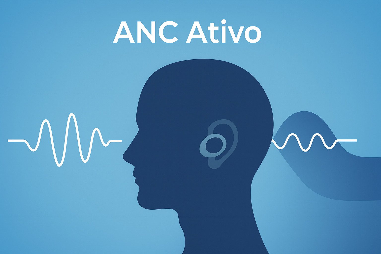 O ANC é uma tecnologia que identifica o som ambiente ao seu redor (como motores, vento, ar-condicionado) usando microfones embutidos no fone. Esses microfones captam o ruído externo em tempo real e o fone gera uma onda sonora inversa (em oposição de fase) para anular esse som antes que ele chegue ao seu ouvido.